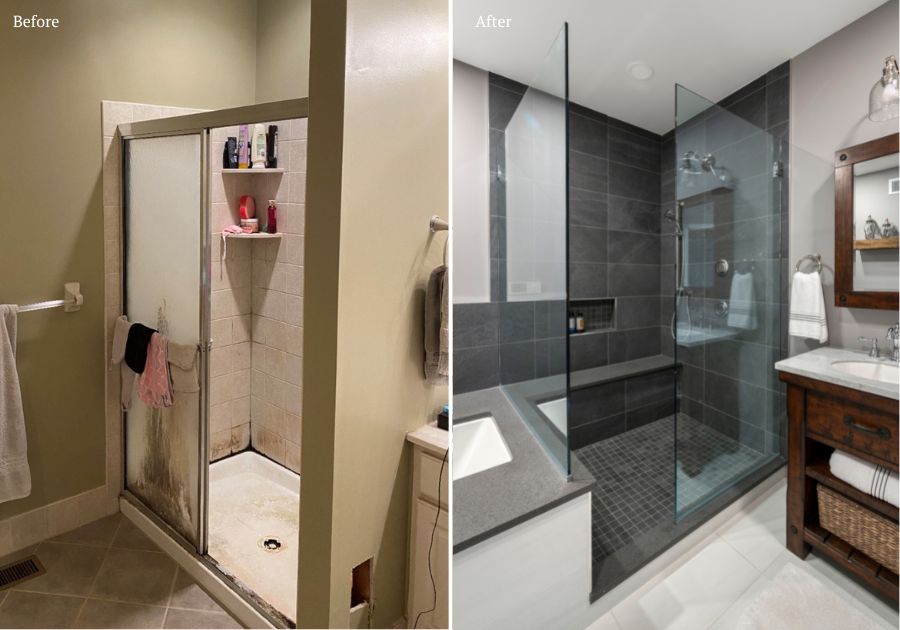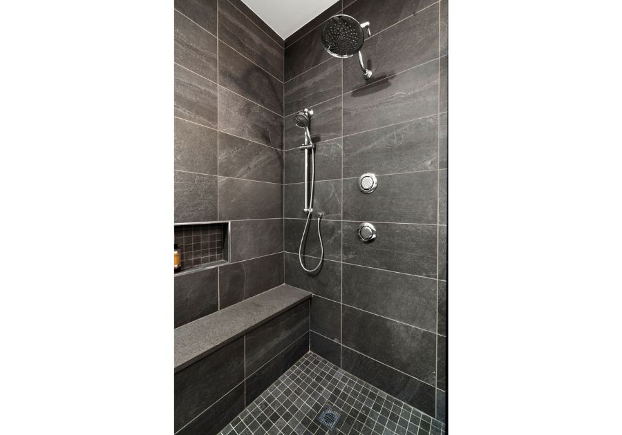 This Blue Bell home’s original shower felt more like a closet. It was confining, difficult to clean, and had limited shelf storage. The homeowners stopped using their primary shower because of all the limitations of the original design. By reconfiguring the bathroom space and shrinking down the footprint of the tub area, we were able to give the homeowners a more open feeling, spa-like shower. We swapped the old shower’s small square beige tile for large-format rich, dark gray and black marbled porcelain tiles. This instantly made the space feel much larger and more refined.